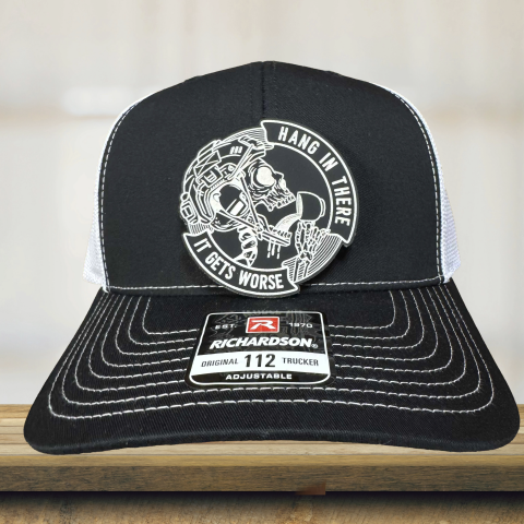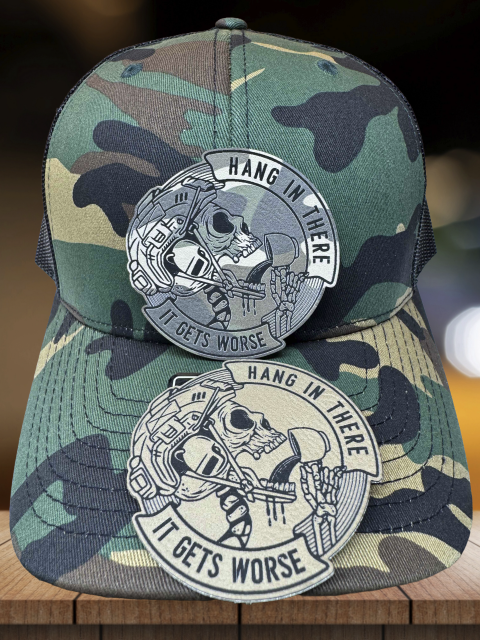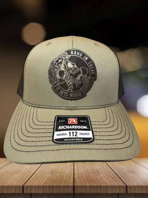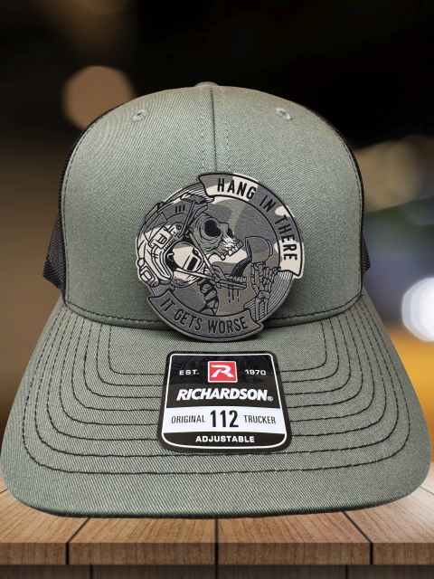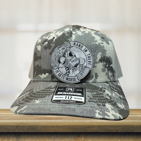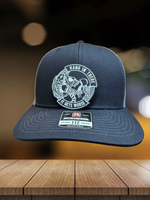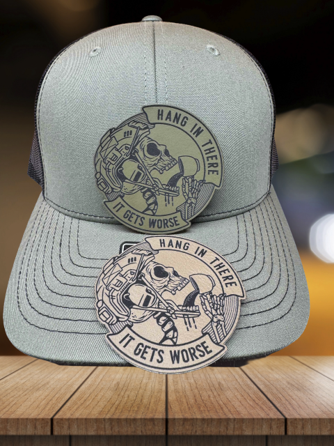 Custom laser engraved leatherette patch with “Hang in there, it gets worse” funny satirical tactical image on a Richardson 112 snapback trucker cap. Multiple color caps and leatherette available. If you don’t see what you want, let me know and I’ll custom make it for you, no extra charge.