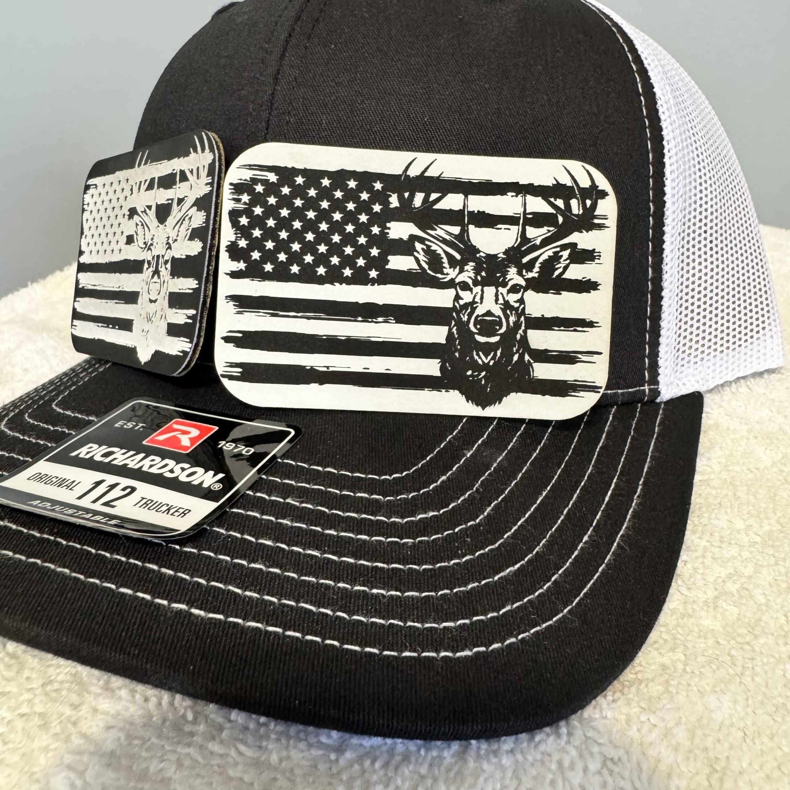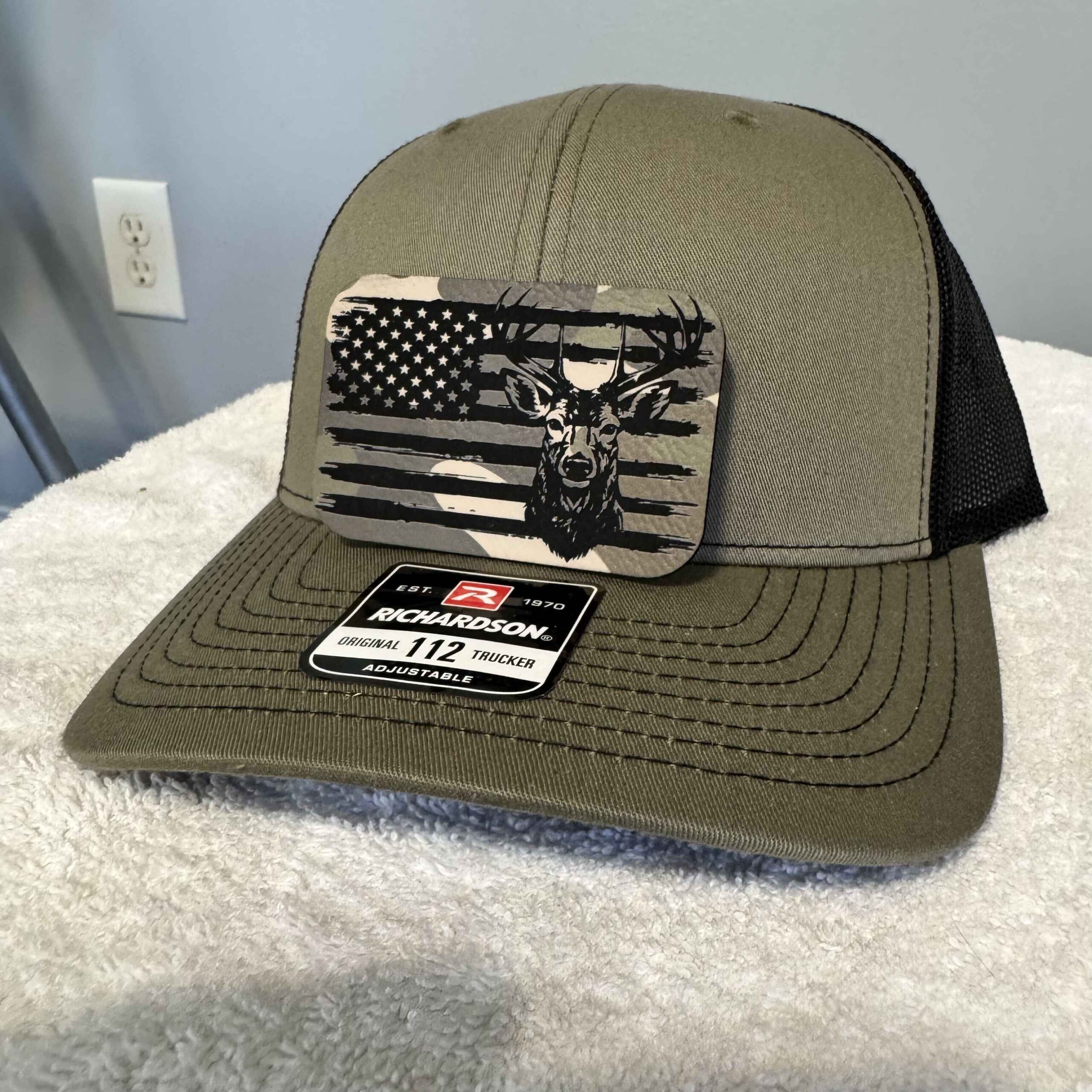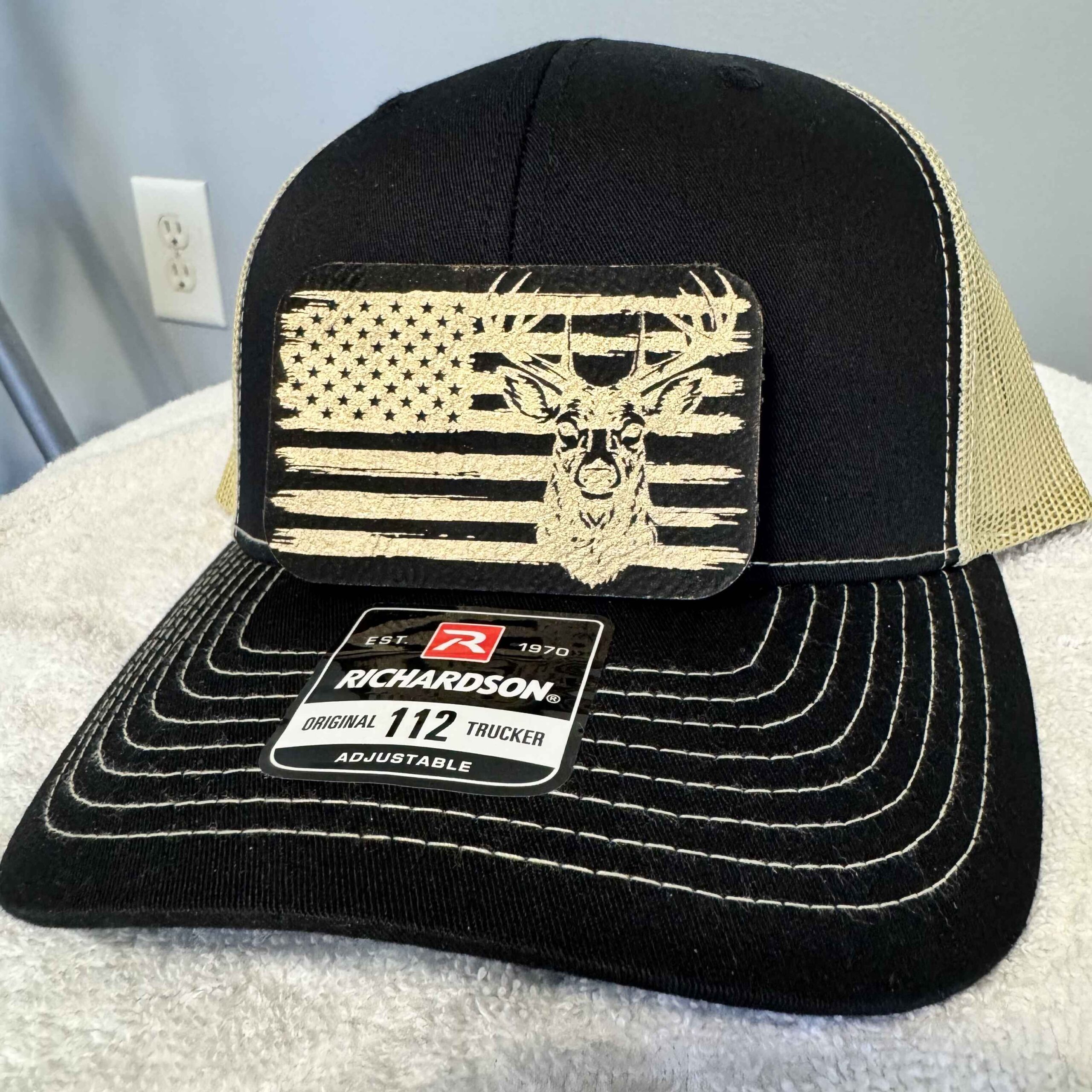 Custom Richardson 112 snapback trucker cap with a laser engraved leatherette patch depicting a USA flag and a buck deer. Perfect for the hunting enthusiast. Lots of different color combos available. If you don’t see what you want, just ask.