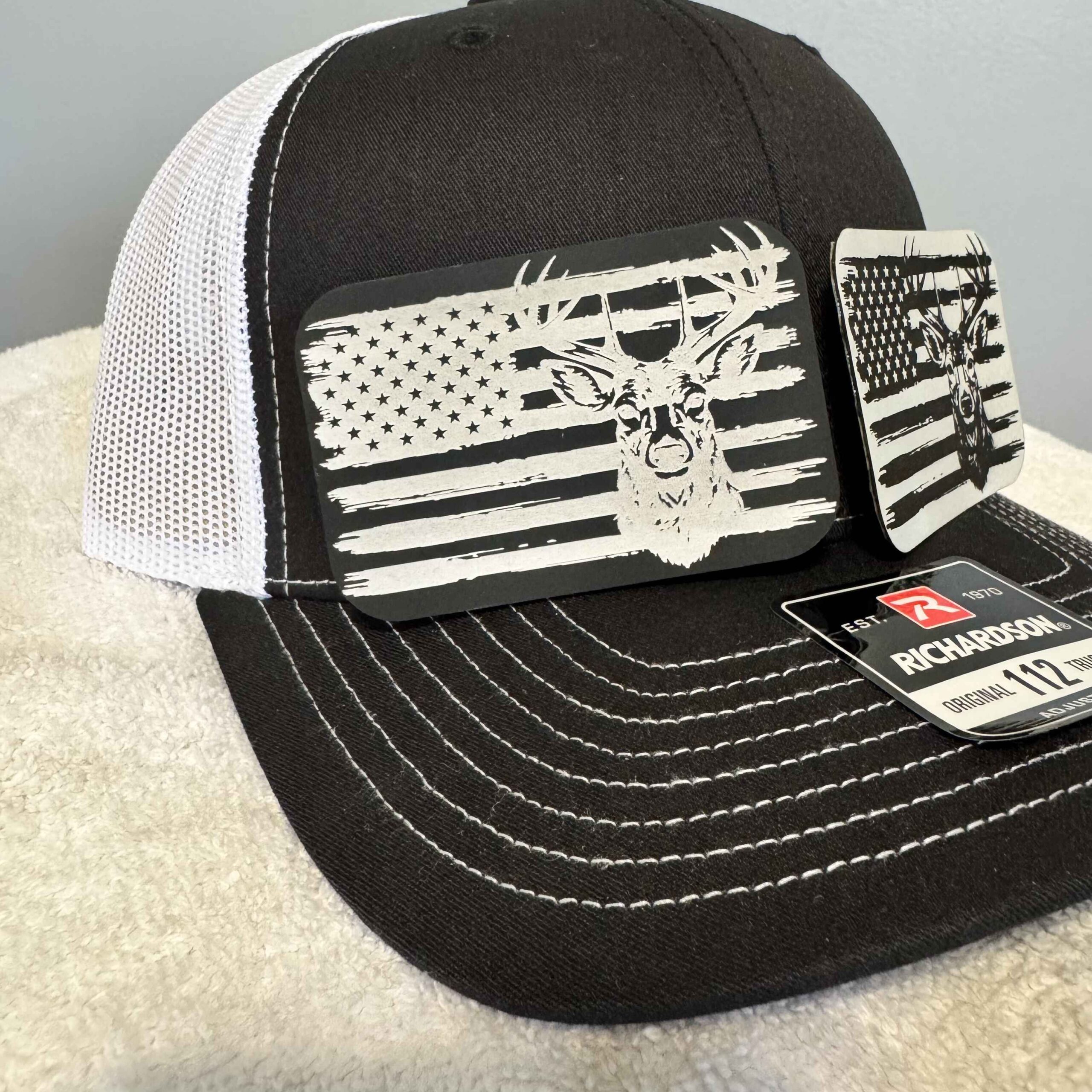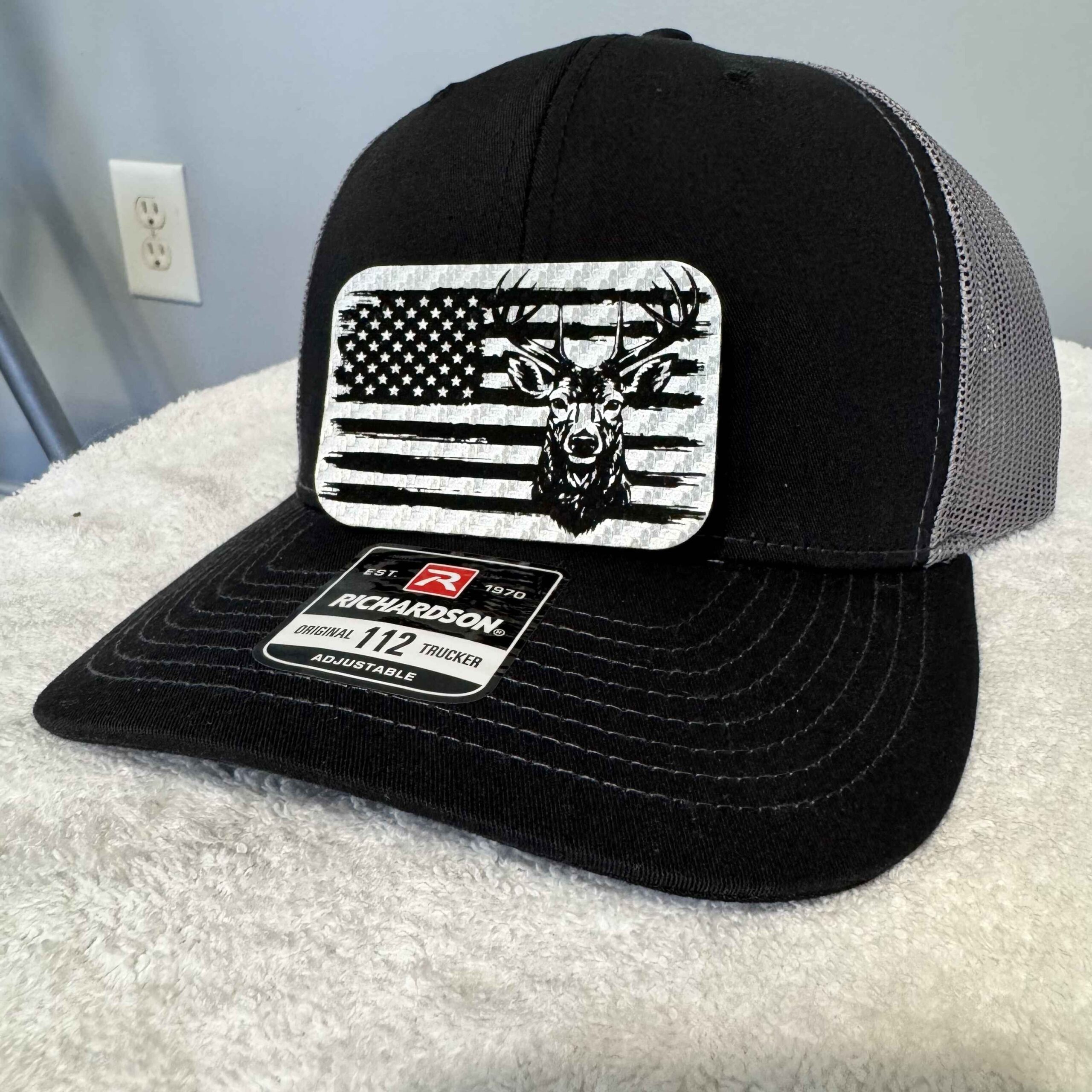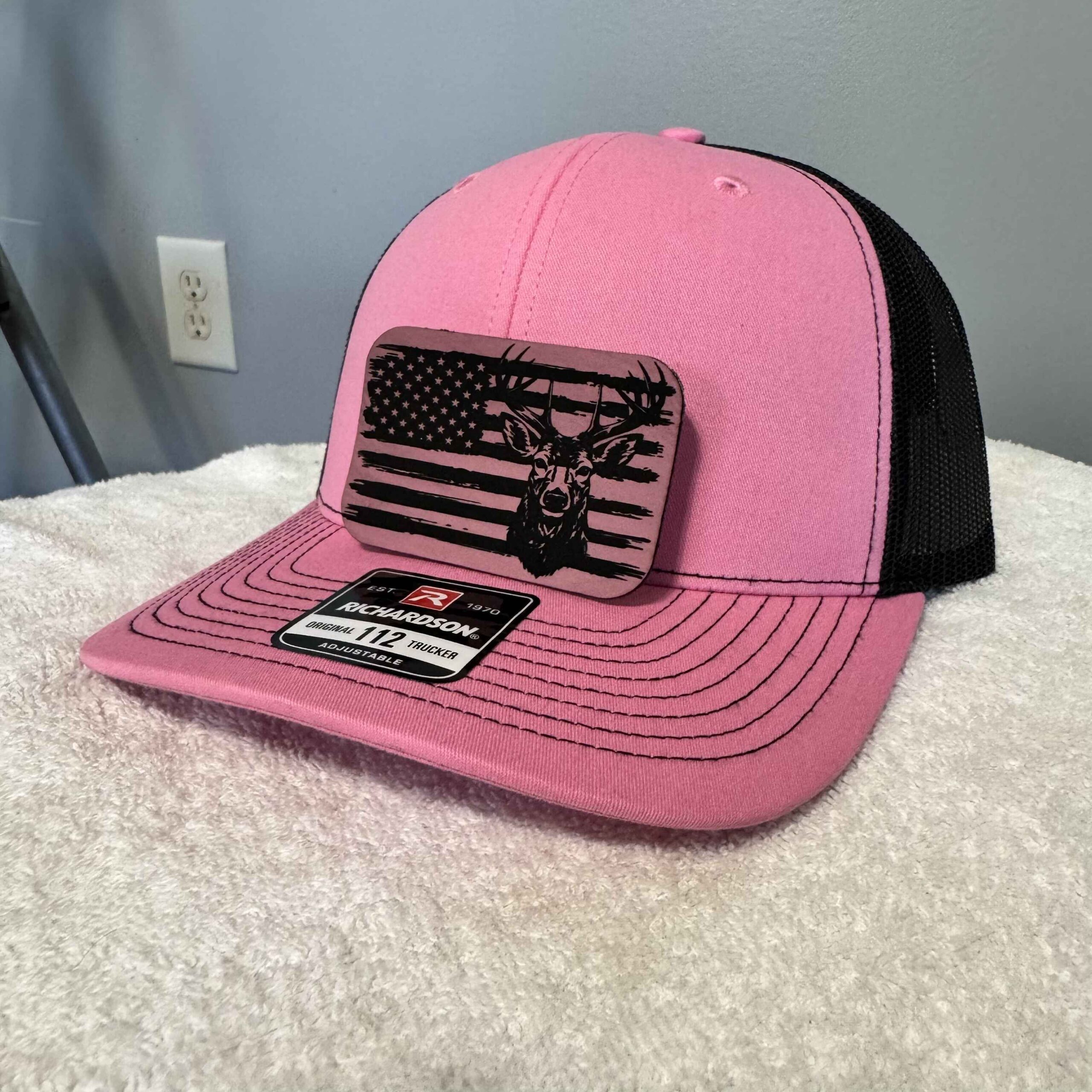 Custom Richardson 112 snapback trucker cap with a laser engraved leatherette patch depicting a USA flag and a buck deer. Perfect for the hunting enthusiast. Lots of different color combos available. If you don’t see what you want, just ask.